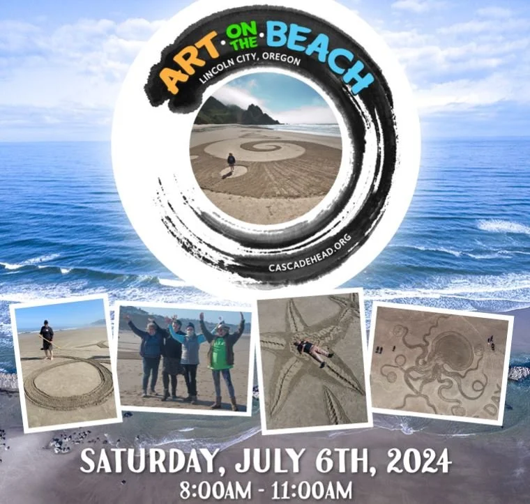 The 4 CAST Project and its partners the City of Lincoln City and the Confederated Tribes of Siletz Indians are celebrating July 4th 2023 with a giant 100 yard long “Interdependence Day” themed sand graphic along the shores of the Cascade Head Biosphere Region and Marine Reserve. This years image will be a Giant Pacific Octopus holding 8 images of our connection with the sea in its arms, scribed on the sands in front of the Chinook Winds Casino Resort starting at 8:00 AM. This year the Cascade Head Biosphere Collaborative and its volunteer rakers will be offering a birds eye view of the Octopus using a drone that will be available on social media to anyone with a smart phone or tablet by reading a handy QR code or by logging onto CascadeHead.org.