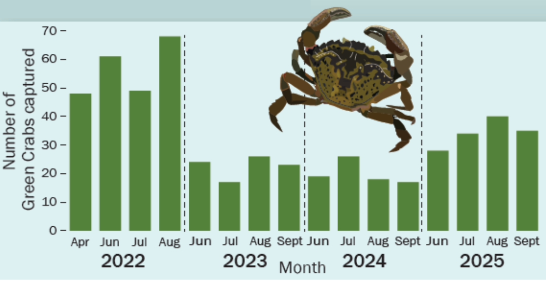 After 4 years of monitoring, we have found that there is a self-reproducing population of Green Crabs at Salmon River Estuary. We have also seen strong variation in captured crab numbers over the 4 years of this study.